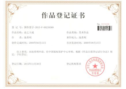 2015年11月30日,我司法人代表池勇利以“品”為原型的作品“品之大成”,在中國(guó)版權(quán)局登記。