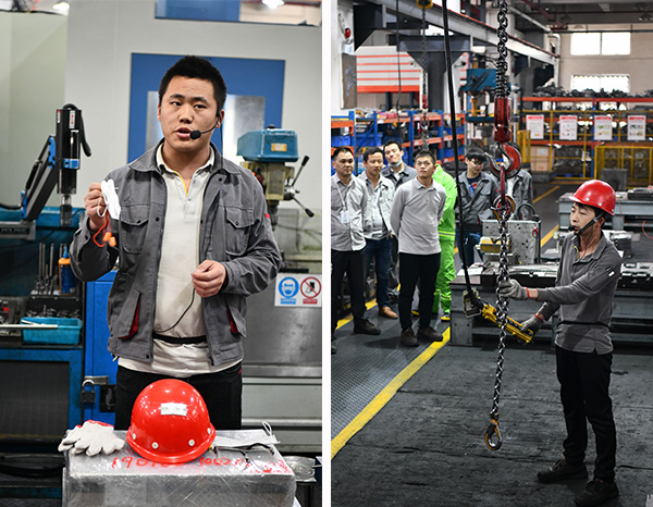 逃生演習(xí)結(jié)束后,全體分為三個(gè)小組進(jìn)行實(shí)操演練。所有項(xiàng)目采用循環(huán)演示方式,保證所有員工都可以觀看到完整的實(shí)操演練。演練項(xiàng)目包括:搬運(yùn)鐵桶的注意事項(xiàng)、防護(hù)用品的標(biāo)準(zhǔn)佩戴方式、翻模的注意事項(xiàng)、叉車(chē)和行車(chē)的正確使用、磨床區(qū)的安全操作、用電安全、機(jī)器維護(hù)常識(shí)、壓鑄機(jī)的周邊隱患等。實(shí)操演練是對(duì)于理論安全知識(shí)的一種具象再現(xiàn),加強(qiáng)了生產(chǎn)安全的學(xué)習(xí)和記憶。
