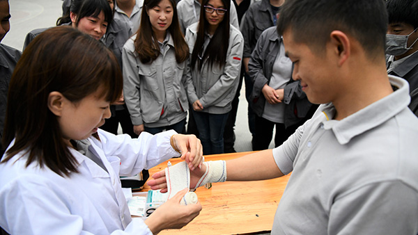 結(jié)束安全實(shí)操演練,進(jìn)入“救護(hù)技能應(yīng)用和消防器材使用”環(huán)節(jié)。公司指派專(zhuān)人進(jìn)行指導(dǎo)演練,演練內(nèi)容包括如何正確報(bào)警、包扎的注意事項(xiàng)、安全繩的正確打結(jié)方式、消防栓以及滅火器的使用。