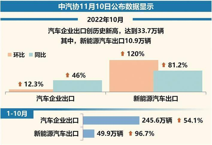 10月,汽車企業(yè)出口創(chuàng)歷史新高,達到33.7萬輛,環(huán)比增長12.3%,同比增長46%。1-10月,汽車企業(yè)出口245.6萬輛,同比增長54.1%。分車型看,乘用車出口197.5萬輛,同比增長57.1%;商用車出口48萬輛,同比增長43%;新能源汽車出口49.9萬輛,同比增長96.7%。