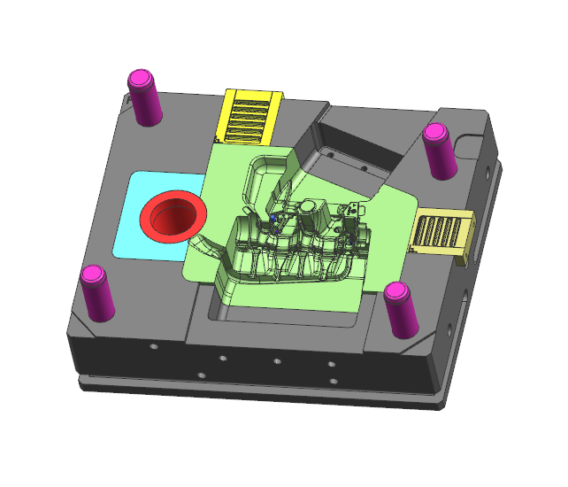 1. 此項目屬汽車曲軸箱模具,產品氣密性要求比較嚴格,模具入料方案采用在壁厚位置撘底的方案;