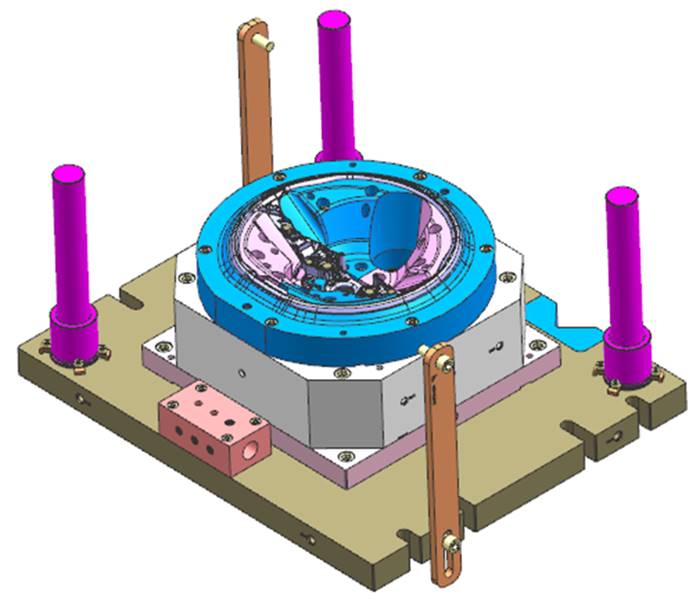 本公司設(shè)計(jì)的方向盤修飾模具,采用了全包圍式的結(jié)構(gòu)設(shè)計(jì),通過下模定位,上模沖剪的結(jié)構(gòu),實(shí)現(xiàn)了方向盤生產(chǎn)過程的穩(wěn)定和精度要求;其特征主要體現(xiàn)在: